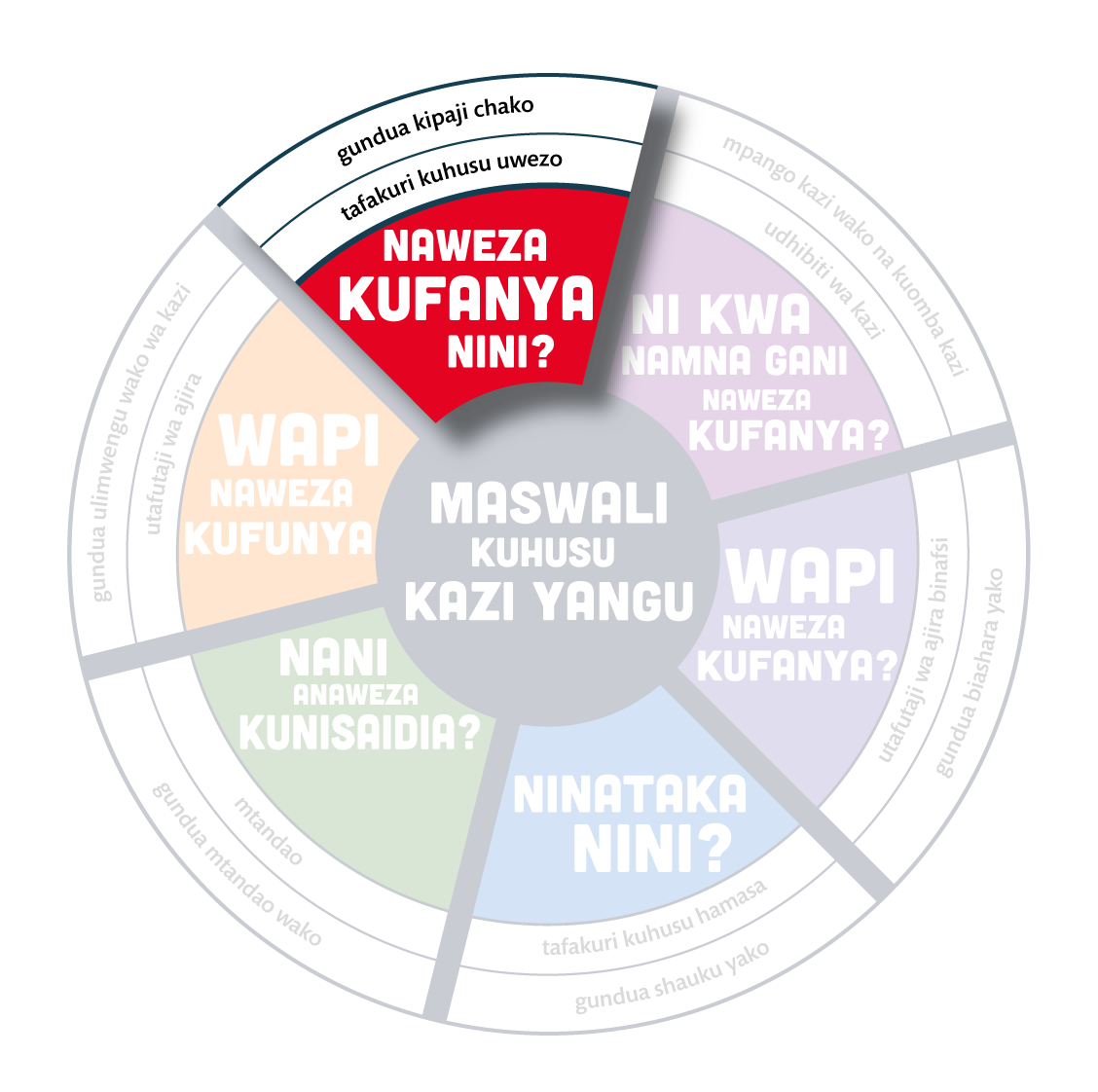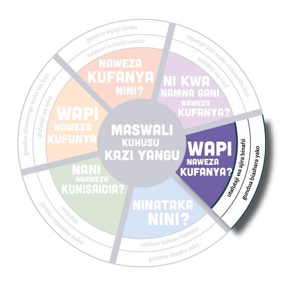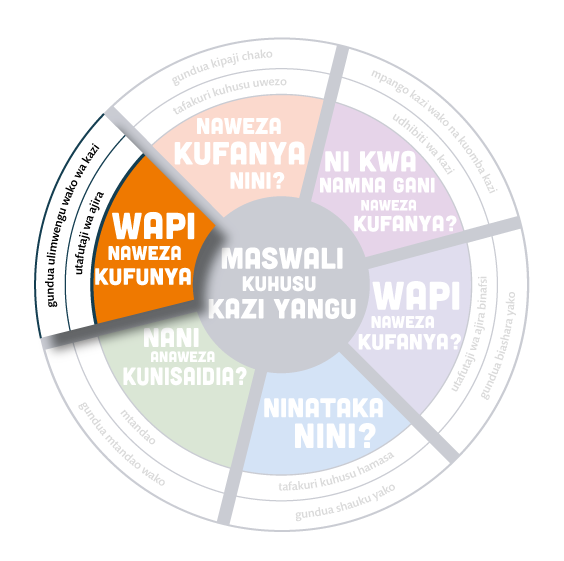 - ‘Mpango kazi wako na kuomba kazi’: udhibiti wa kazi, mipango inayohusiana na kazi na ufafanuzi binafsi wa nafasi kwa mchakato wako wa kujifunza na kazi.