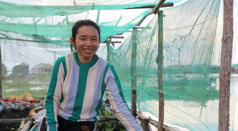 Dankzij training en steun van VSO heeft Kem nu een drijvende moestuin als alternatief inkomen.