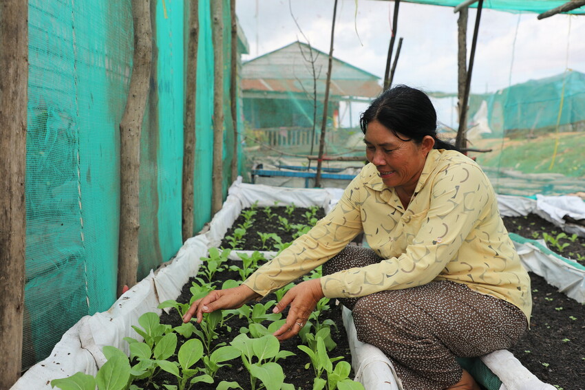 Chum Srey Nga met haar drijvende moestuin, gemaakt van recyclebare materialen zoals plastic flessen.